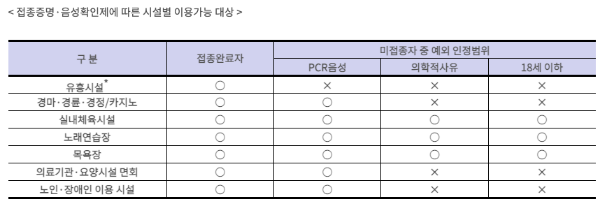 ○ 미접종자는 ①코로나19 PCR 음성 확인 또는 ②의학적 사유에 의한 적용예외 확인 후 시설 이용이 가능하다.
