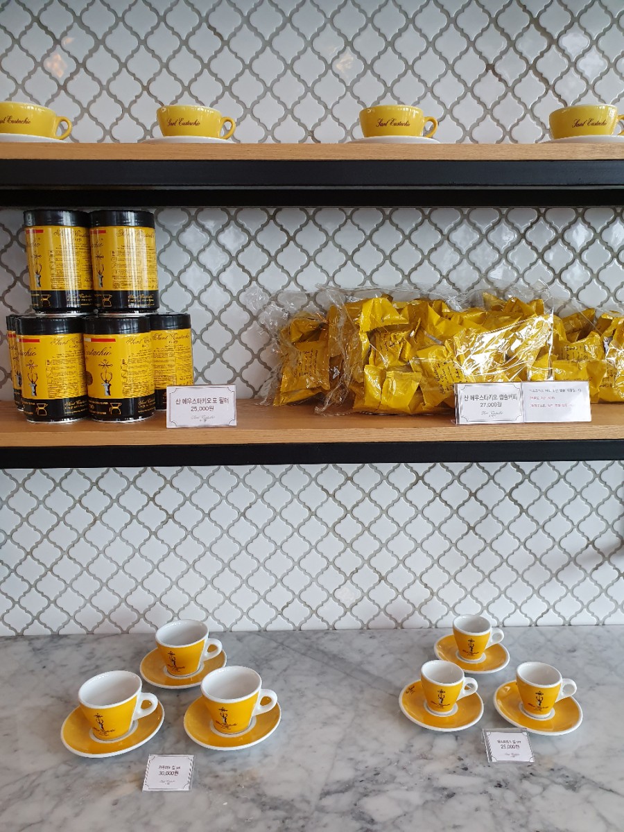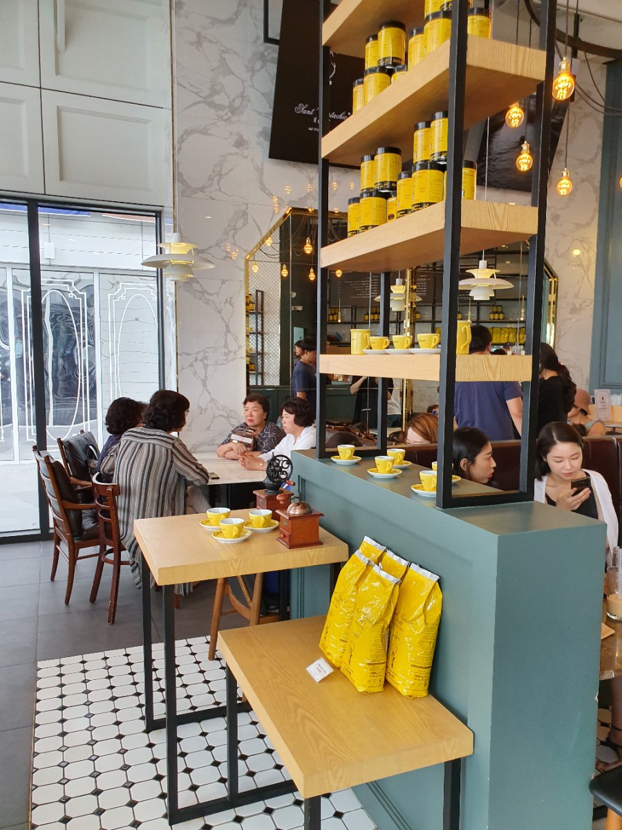 노란색 아기자기 컵들이 너무 귀엽구 대리석 인테리어가 엄청 고급졌다.