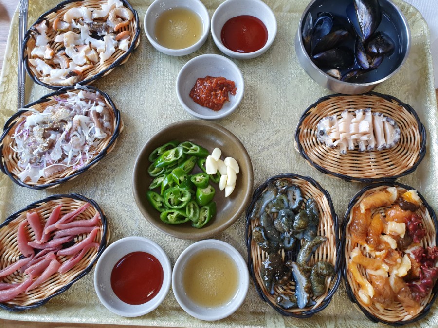 여기는 회는 아니고 해산물 들이랑 전복죽을 중심으로 이렇게 한상차림을 해주는 식당으로 즐비했다.
