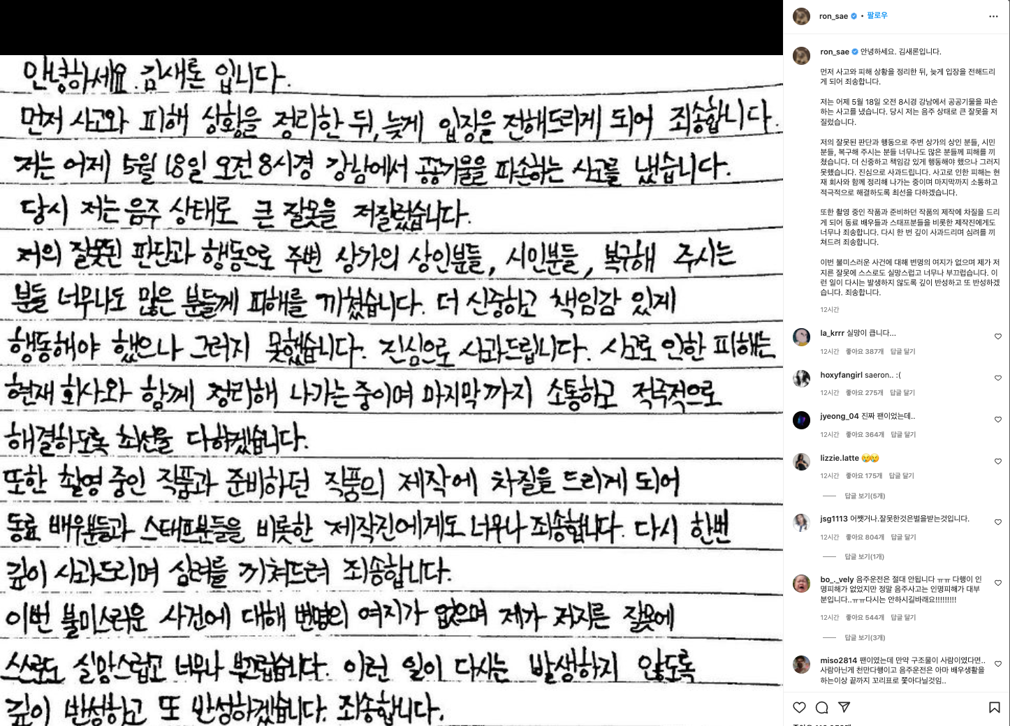 “먼저 사고와 피해 상황을 정리한 뒤 늦게 입장을 전해 죄송하다. 저는 어제 5월 18일 오전 8시께 강남에서 공공기물을 파손하는 사고를 냈습니다. 음주 상태로 큰 잘못을 저질렀습니다. 저의 잘못된 판단과 행동으로 주변 상가 상인, 시민, 복구해준 분들 등 너무나도 많은 분들께 피해를 끼쳤습니다. 더 신중하고 책임감있게 행동해야 했으나 그러지 못했습니다. 진심으로 사과드립니다.