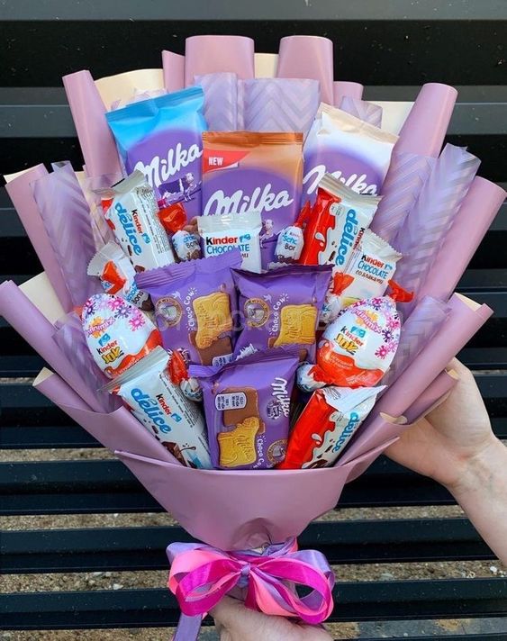 킨더 초콜릿으로 만든 초콜릿과 밀카 초콜릿으로 만든 꽃다발을 선물해 보세요.