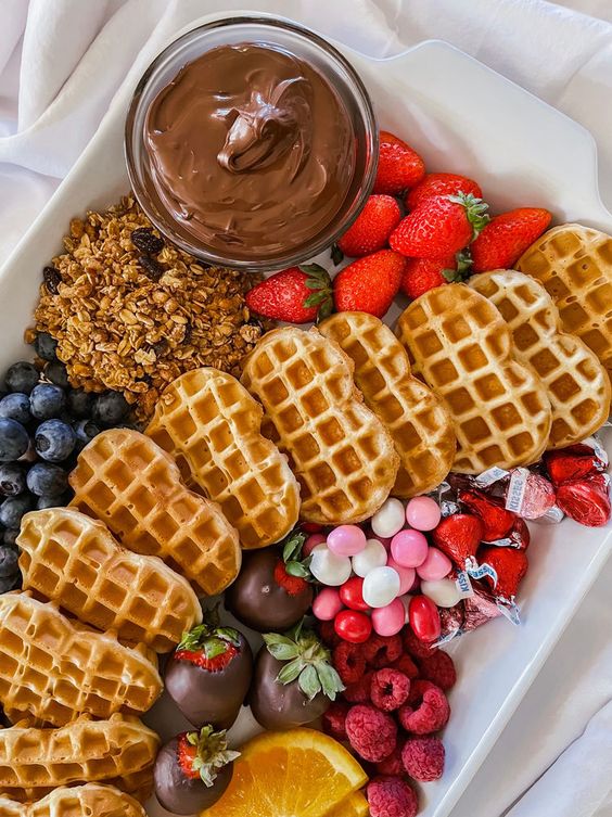 딸기가 제철인만큼 와플과 디핑소스를 준비하여 만든 플래터는 발렌타인을 더욱 풍성하게 보낼 수 있게 해줍니다.