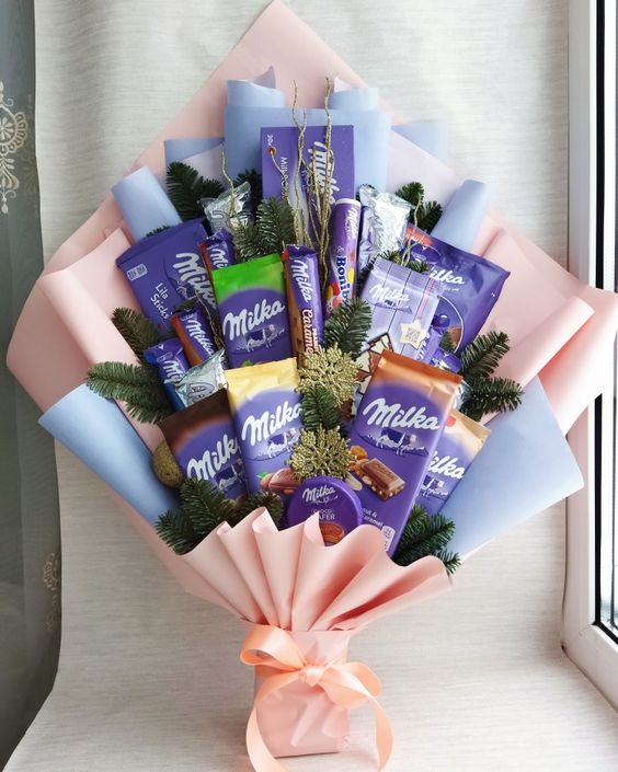킨더 초콜릿으로 만든 초콜릿과 밀카 초콜릿으로 만든 꽃다발을 선물해 보세요.