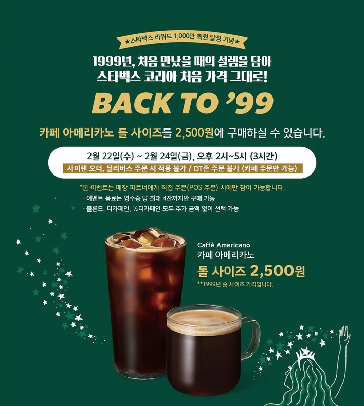 1999년 처음 만났을 때의 설렘을 담아 스타벅스 코리아 처음 가격으로 아메리카노를 주문 할 수 있는데요,