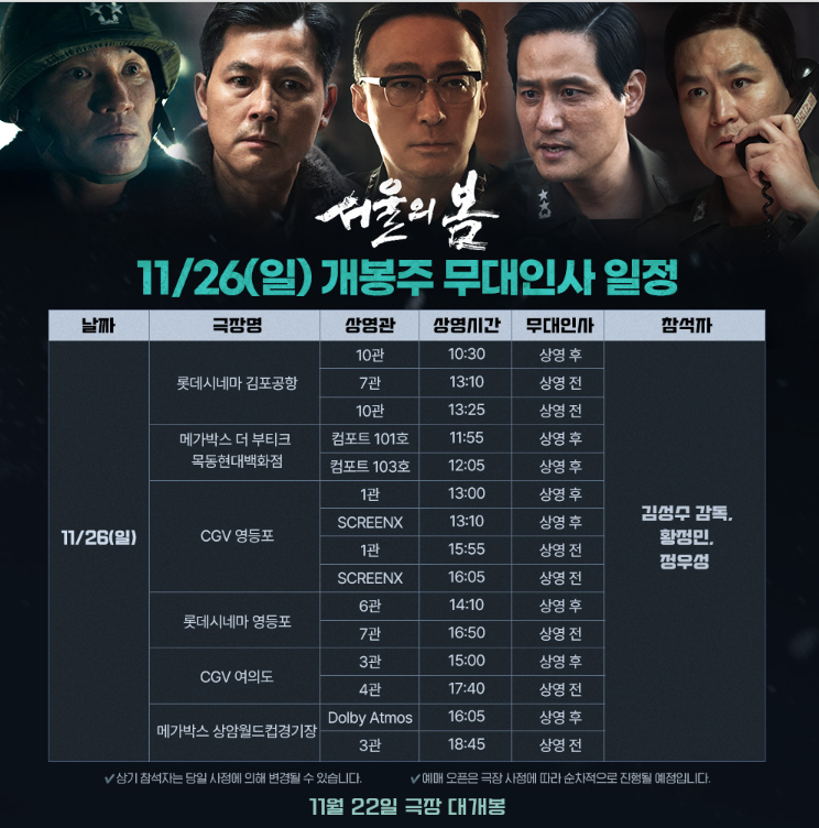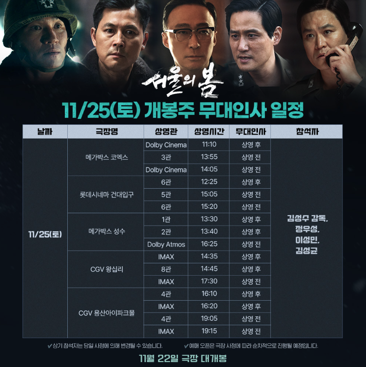 개봉주에 맞춰 김성수 감독을 비롯하여 정우성, 이성민, 김선균 배우까지 관객들을 직접 찾아 인사할 예정이라고 하니 관심 있는 분들은